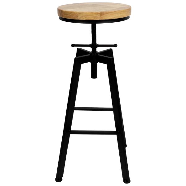- Istuimessa on pyöreä, sileä puupinta, ja jalusta on valmistettu mustasta metallista, mikä antaa tuolille tukevan ja modernin ilmeen
