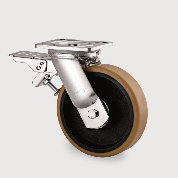 Teollisuuspyörä polyuretaanipinnalla. Täysjarru. Pyörässä on valurautainenen runko ja sinkkipinnoitettu teräslevypidike. Tarkkuuskuulalaakerointi.