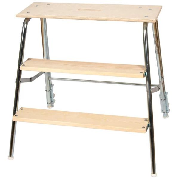 Tuotenumero: YB196365-portainen tressi puisella alustalla ja pidennetyillä jaloilla. Pukissa on vahvoista sähkösinkityistä teräsputkista valmistetut taitettavat jalat, ja ylin porras on vedenpitävää vaneria. Tason korkeus on 125 cm.