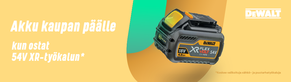 Osta Dewalt 54V XR sähkö- tai puutarhatyökalu 1.10.–14.12. välisenä aikana ja saat Dewalt 54V 6,0Ah Li-Ion -akun*. Vain 1 akku asiakasta kohti. Tarjous koskee vain tällä sivulla esitettyjä koneita.