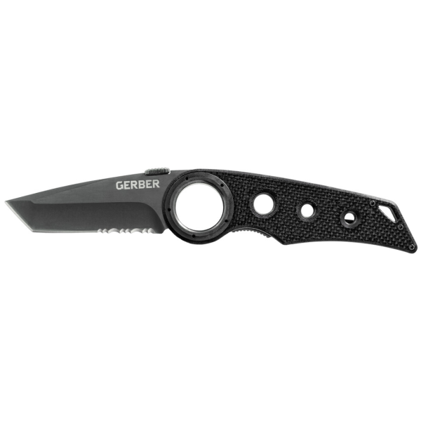 Kahva G-10-komposiittia mukana sahalaitainen terä. Musta kotelo.