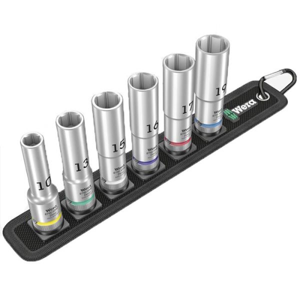 Wera Belt C Deep 1 on 6-osainen hylsysarja 1/2" vääntiölle. Värikoodatut hylsyt helpottavat oikean koon tunnistamista. Kuusioprofiili mahdollistaa suurten voimien siirron ja kuormittaa vähemmän ruuvien tai ruuvipäiden reunoja tai ruuvipäitä verrattuna kaksinkertaiseen kuusioprofiiliin. Soveltuu myös ahtaisiin tiloihin. Toimitetaan kangaskotelossa, jossa on kiinnityshihna esimerkiksi seinälle, hyllyyn, korjaamovaunuun tai Wera 2go -työkalukuljetusjärjestelmään kiinnittämistä varten.