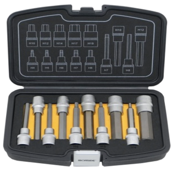 Mattakromattu kromivanadiiniteräs. Kuusiokolokärkihylsyt 1/2"-kiinnityksellä. Sisältää 10 kpl kuusiokolokärkihylsyjä 100 mm: 4, 5, 6, 7, 8, 10, 12, 14, 17, 19 mm. Toimitetaan muovisessa laatikossa, jossa kaksivärinen EVA-vaahtomuovisisusta mikä helpottaa puuttuvien osien havaitsemista.