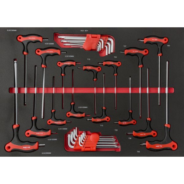 PELA 497997 on työkalumoduuli PELAn työkaluvaunuihin ja työpistekalusteisiin. Toimitetaan vaahtokumialustassa, joka asetetaan laatikkoon - tällä tavalla työkalut pysyvät paikallaan. 35-osainen torx- ja kuusiokoloavainsarja, joka sisältää kromivanadiiniteräksestä valmistettuja työkaluja lajiteltuna vaahtomuoviseen moduuliin, jossa on oma paikka ja merkintä kullekin työkalulle.