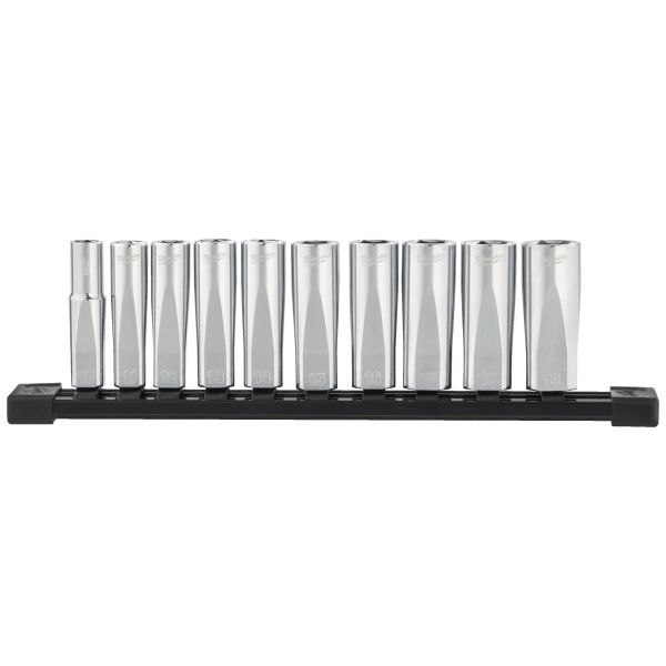 Milwaukee 4932492509 on 10-osainen sarja pitkiä 3/8"-kromihylsyjä hylsykiskolla. Hylsyjen litteät ja vääntövalmiit FOUR FLAT™ -sivut estävät hylsyn vierimisen kaltevalla pinnalla.