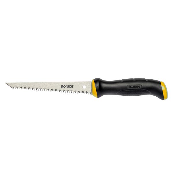 Käsisaha/käsipistosaha reikien tekemiseen kipsilevyyn. Tukeva terä, jonka hampaat päättyvät terävään kärkeen.