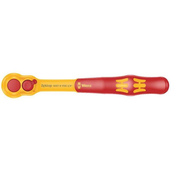 Wera 8007 B VDE Zyklop on eristetty räikkä 3/8-tuumaisella vääntiöllä ja suunnanvaihtovivulla, turvallinen työskentely aina 1000V asti. Kapea muotoilu helpottaa työskentelyä hyvin ahtaissa tiloissa. Hieno hammastus, jonka 80 hampaan ansiosta palautuskulma on vain 4,5°. Varma hylsyn lukitus napain painalluksella.