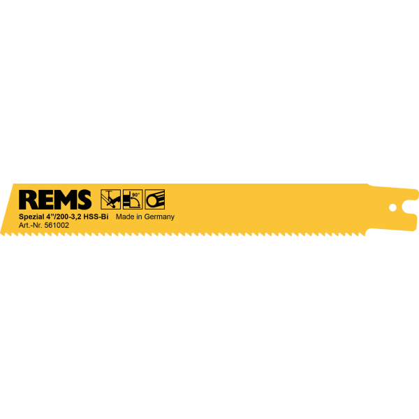 REMS-yleissahanterä, jonka pituus on 200 mm ja hammasjako 3,2 mm. Teräsputkille ≤ 4". Haritettu hammastus takaa siistin jäljen pienellä hammasjaolla.