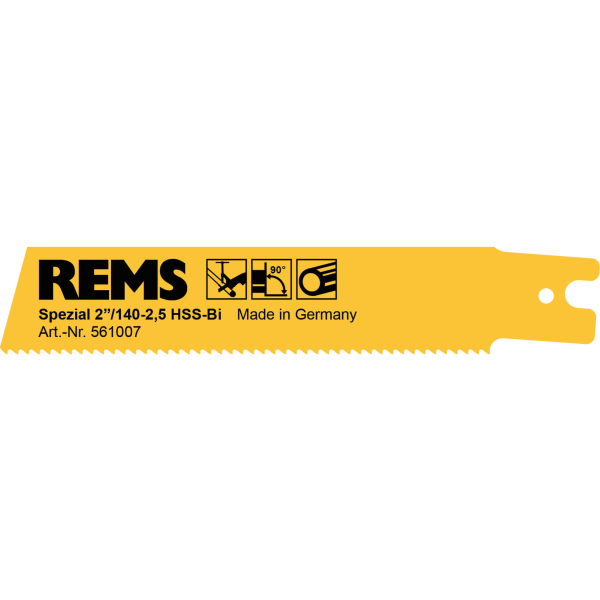 REMS-yleissahanterä, jonka pituus on 140 mm ja hammasjako 2,5 mm. Teräsputkille ≤ 2". Haritettu hammastus takaa siistin jäljen pienellä hammasjaolla.