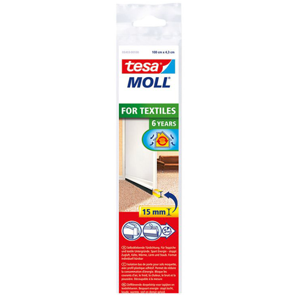 Tesa 05403-00100-00 on yleiskäyttöinen itsekiinnittyvä oven harjatiiviste kokolattiamatoille. Jos haluat pitää lämmön sisällä ja estää kylmän ilman ja pölyn pääsyn sisätiloihin, tesamoll® Kokolattiamattotiiviste on oikea ratkaisu. Itsekiinnittyvä oven harjatiiviste suojaa tehokkaasti vedolta, ja se on kehitetty erityisesti nukkamatoille. Se on helppo kiinnittää ovilevyyn reikiä poraamatta ja ilman ruuveja. Muovitiivisteen voi leikata jokaiselle ovelle sopivaksi. Tiivisteharjan erikoispitkät ja joustavat nailonharjakset tiivistävät jopa 15 mm:n raot ovilevyn ja lattian välissä.