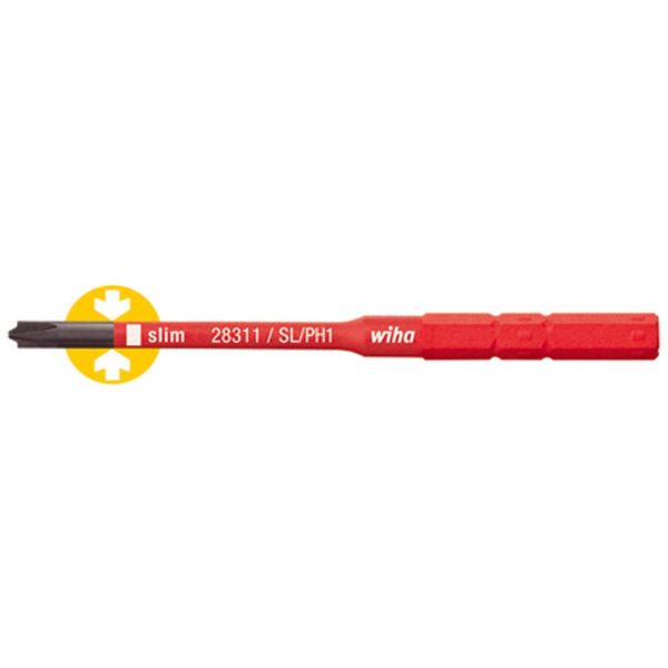 Wiha SlimBit-ohutkärki electric PlusMinus/Phillips, joka mahdollistaa turvallisen työskentelyn jännitteisten osien parissa 1 000 V AC saakka. 6 mm slimBit-ohutkärkiä saa käyttää vain speedE®-, slimVario®- tai TorqueVario®-S electric -työkaluissa. Pituus 75 mm. Tavanomaisten sähköasentajan ruuvimeisseleiden terän halkaisija on usein niin suuri, että niillä ei pääse käsiksi syvällä oleviin ruuveihin. Niiden eristystä ei kuitenkaan saa poistaa, ja siitä olisi myös seurauksena turvallisuuden vaarantuminen. Erityisesti sähkötöitä varten kehitetyssä Wiha slimTECHNOLOGY -muotoilussa suojaeristys on integroitu terään jopa 33 % kapeampien terien mahdollistamiseksi. slimBit-kärkien avulla pääset vaivattomasti käsiksi myös syvällä oleviin ruuvi- ja jousielementteihin. Eristetyille slimBit-kärjille suoritetaan kansainvälisen standardin IEC 60900 mukainen kappaletarkastus, ja ne mahdollistavat turvallisen työskentelyn jännitteisten osien parissa 1 000 V AC saakka.