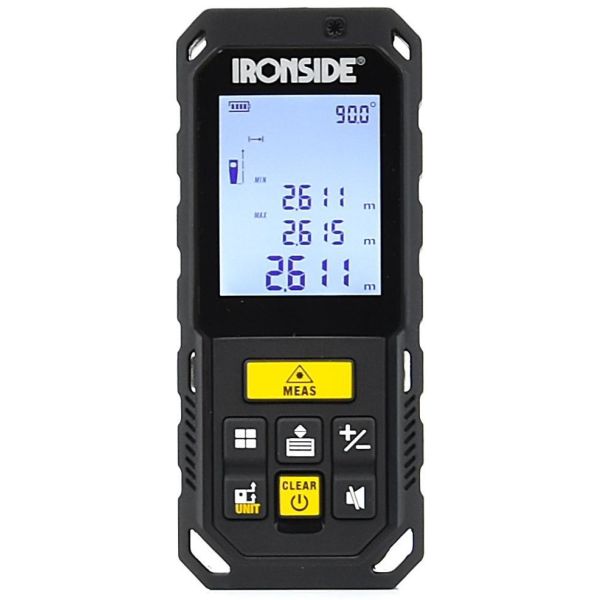 Ironside 103496 on etäisyysmittari (Heavy Duty) 2 tuuman valkoisella näytöllä (musta tausta). Suunniteltu tarjoamaan hyvän tarkkuuden ja helppokäyttöisyyden. Vankan 280° kumikotelon ja 1 metrin pudotuskestävyyden ansiosta se on suunniteltu kestämään vaativia työympäristöjä. Split shot -tekniikka ja monitila lisää monipuolisuutta. 360° kallistusanturi. Mahdollistaa etäisyyden mittauksen, pinta-alan mittauksen, jatkuvan mittauksen ja tilavuusmittauksen. Lisäksi automaattinen tasaus sekä Pythagoras 2 - ja Pythagoras 1 -mittaukset sekä lisäys/vähennys.