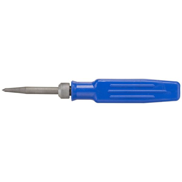 Kovametallikärki. Terä on käännettävissä ja sen voi työntää varren sisään. Kahva muovia. Halkaisija: 7 mm. Pituus: 90 mm.