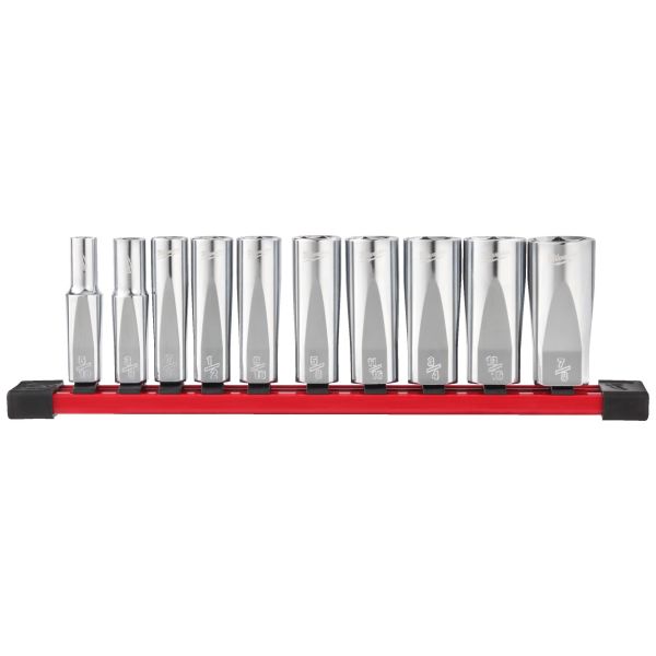 Milwaukee 4932492510 on 10-osainen sarja pitkiä 3/8"-kromihylsyjä hylsykiskolla. Hylsyjen litteät ja vääntövalmiit FOUR FLAT™ -sivut estävät hylsyn vierimisen kaltevalla pinnalla.