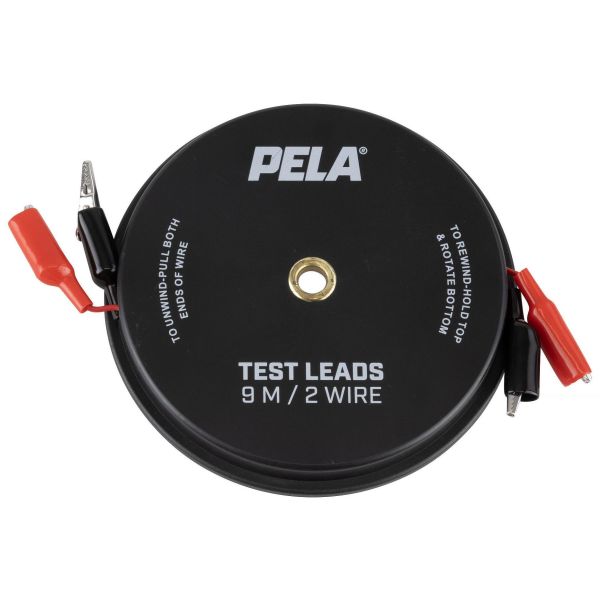 PELA 549451 kuparijohdinkaapelit punaisella ja mustalla PVC-suojauksella, krokotiiliklipsit molemmissa päissä. Kaapelin pituus on 9 metriä rullalla, mikä mahdollistaa sähköpiirien helpon testaamisen ilman irtonaisista kaapeleista johtuvaa sotkua. Maksimivirransiirto 6 ampeeria rullalla, 10 ampeeria täysin venytettynä.