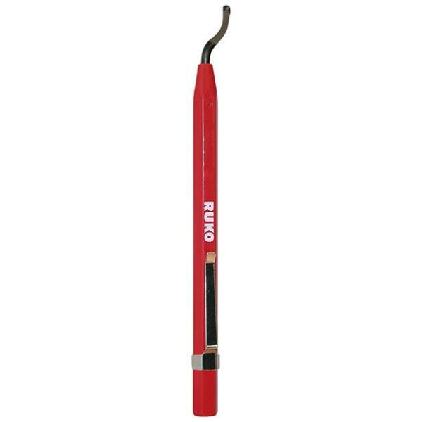 Ruko 107052 -jäysteenpoistaja kiinnikkeellä ja E 100 -terällä. Pieni ja kätevä jäysteenpoistaja, jossa on kuusikulmainen alumiinikahva.