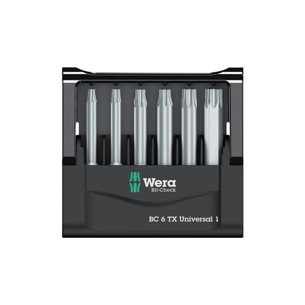 Wera Bit-Check 6 TX Universal 1 on 6-osainen kärkisarja, jossa Torx-kärkiä koossa TX10 x 50 mm till TX40 x 50 mm.