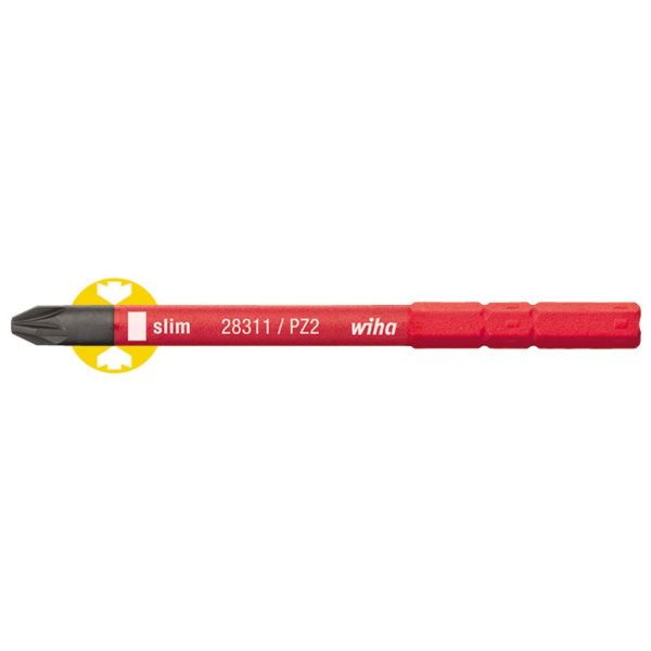 Wiha SlimBit-ohutkärki electric Pozidriv, joka mahdollistaa turvallisen työskentelyn jännitteisten osien parissa 1 000 V AC saakka. 6 mm slimBit-ohutkärkiä saa käyttää vain speedE®-, slimVario®- tai TorqueVario®-S electric -työkaluissa. Pituus 75 mm. Tavanomaisten sähköasentajan ruuvimeisseleiden terän halkaisija on usein niin suuri, että niillä ei pääse käsiksi syvällä oleviin ruuveihin. Niiden eristystä ei kuitenkaan saa poistaa, ja siitä olisi myös seurauksena turvallisuuden vaarantuminen. Erityisesti sähkötöitä varten kehitetyssä Wiha slimTECHNOLOGY -muotoilussa suojaeristys on integroitu terään jopa 33 % kapeampien terien mahdollistamiseksi. slimBit-kärkien avulla pääset vaivattomasti käsiksi myös syvällä oleviin ruuvi- ja jousielementteihin. Eristetyille slimBit-kärjille suoritetaan kansainvälisen standardin IEC 60900 mukainen kappaletarkastus, ja ne mahdollistavat turvallisen työskentelyn jännitteisten osien parissa 1 000 V AC saakka.