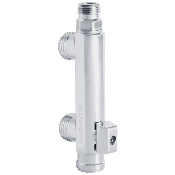 Jakelija kaksisuuntainen, 60 cc asennettavaksi G15-liitännällä varustetulle seinälevylle. G10-ulkokierre päällä esim. puolikytkimen tai letkun liittämiseen leikkisällä mutterilla ja litteällä tiivisteellä. Kromattu. Lyijytöntä, sinkkikarkaistua messinkiä. Lisävarusteena on nipat mitoissa G10, G15 ja G20.