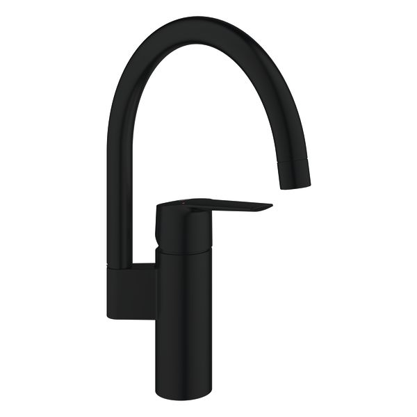 Grohe Start on tyylikäs mattamusta keittiöhana korkealla kääntyvällä C-juoksuputkella.