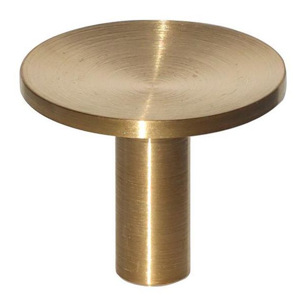 Harjatusta messingistä valmistettu nuppi Gustavsbergiltä, ⌀ 28 mm. Voidaan käyttää myös ripustuskoukkuna.