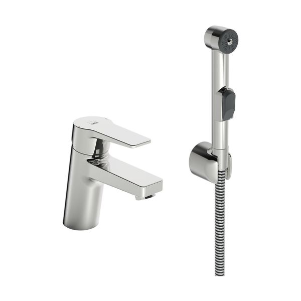 Pesuallashana Bidetta-käsisuihkulla, kiinteällä juoksuputkella ja poresuuttimella. Suihkuletku 1,5 m ja käsisuihkun pidike. Integroitu lämpötilan ja virtauksen rajoitus. Virtauksenrajoitin 6,0 l/min. Joustava liitäntä. G3/8" sisäkierre. 4MS-hyväksytty messinkiseos.
