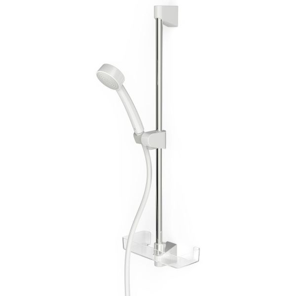 Oras Apollo ECO -suihkusetti, jossa on Ø 18 mm:n suihkutanko, 1 500 mm:n suihkuletku, vettä säästävä käsisuihku (7 l/min), jossa on kalkinestotoiminto, läpinäkyvä ja helposti puhdistettava saippua-astia ja erillinen käsisuihkun seinäkiinnike.