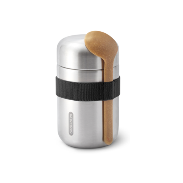 Black+Blum kätevä 400 ml ruokatermos, joka sopii hyvin yhdelle henkilölle. Käytännöllinen joustonauha pitää ympäristöystävällisestä puukuitusekoitteesta valmistetun lusikan paikoillaan silloin, kun sitä ei käytetä.