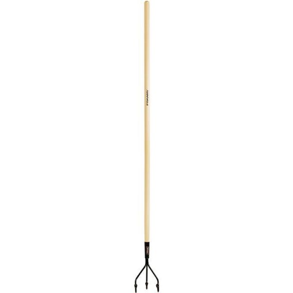 Fiskars 5300 on 1440 mm pitkä kultivaattori, jossa on puinen kahva ja teräksinen pää.