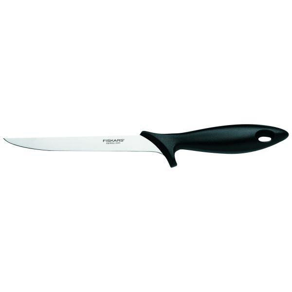 Fiskars Essential -fileointiveitsen terä on valmistettu japanilaisesta ruostumattomasta teräksestä, ja veitsen mustassa muovikahvassa on rosoinen viimeistely. Soveltuu hyvin kalan fileointiin.