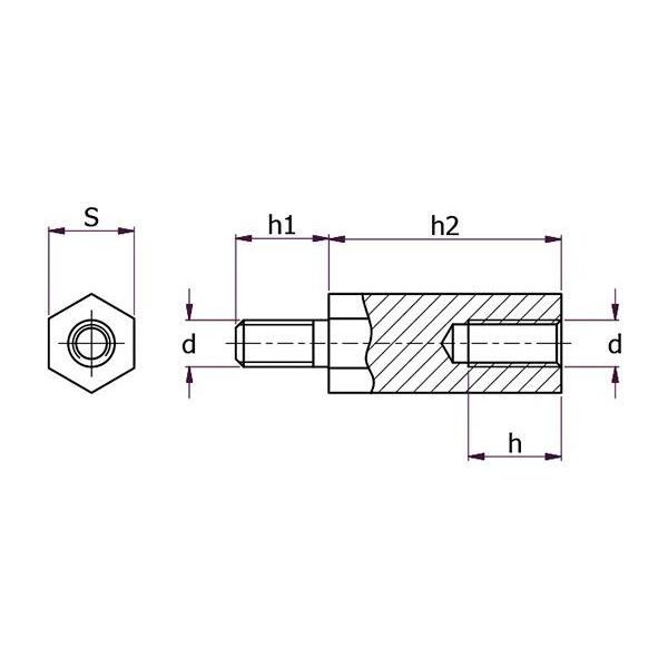 Pyöristetyllä kierteellä varustettu uros-naaras-koroke takaa tukevan kiinnityksen ja tasaisen alustan ilman erillistä aluslevyä (välilevyn pituus 20.0 mm). Korokkeen muoto kuusikulmainen, uros- ja naaraspuolisella osalla. Ruostumattomasta teräksestä. Avainväli 10.0 mm, sisäkierteen pituus 12.0 mm ja kierteen pituus 10.0 mm.