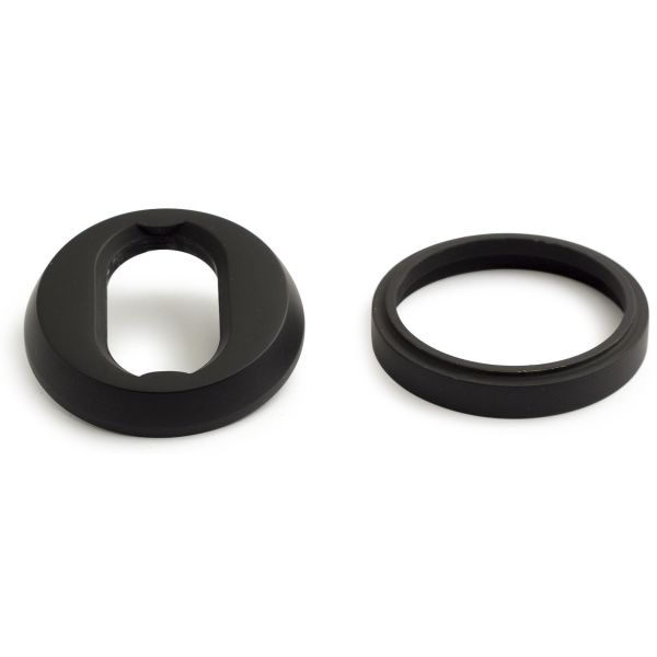 Sylinterirengas Universal, musta. Ulkopuolen peitekilpi 9 mm + korotusrengas 7 mm messinkiä. Jos sylinteri työntyy ovilehdestä ulos 6–11 mm, asennetaan vain kilpi. Jos sylinteri työntyy ovilehdestä ulos 12–18 mm, asennetaan sekä kilpi että korotusrengas. Jos ulkonema on suurempi, asennetaan lisäksi Extra-peitekilpi. Täydennetään sisäpuolen Universal-peitekilvellä ja katkouraruuveilla M5.
