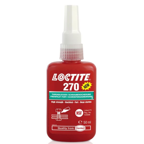 Loctite® 270 on suurilujuuksinen kierrelukite tärinästä aiheutuvaan pulttien, muttereiden ja vaarnaruuvien aukeamisen tehokkaaseen estämiseen ja tiivistämiseen.Tällä tuotteella lukitset pysyvästi kokoonpanot, jotka eivät saa aueta. Toimii kaikilla metalleilla mukaanlukien passiiviset pinnat, kuten ruostumaton teräs, alumiini ja pinnoitetut materiaalit. Se sietää teollisten öljyjen esim. moottoriöljy, korrosiosuoja-aineiden ja leikkuunesteiden aiheuttamaa lievää epäpuhtautta. Voidaan purkaa lämmittämällä 300 asteeseen.