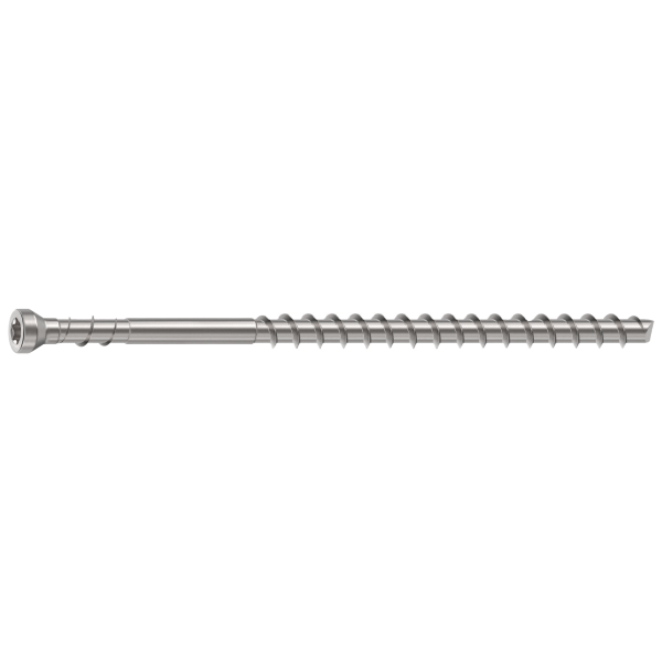 Syvä T15 TX-ura antaa erinomaisen otteen ja lisää kiinnityksen sujuvuutta. Tämä vähentää otteen luistamisen riskiä ruuvaamisen aikana ja suojaa ruuvin pintakäsittelyä. Käänteinen yläkierre puristaa materiaalit tiukasti yhteen ja jättää siistin asennusjäljen. Kierteen muoto muodostaa erinomaisen kantokyvyn optimoidun kierteen ja halkaisijan suhteen ansiosta. Ruostumaton teräs 316SS (A4). Patentoitu talttakärki leikkaa puukuituja ruuvattaessa, mikä minimoi halkeilun riskin kiinnityksessä. Kovempien puulajien puutavaran kiinnityksessä suositellaan esiporausta.