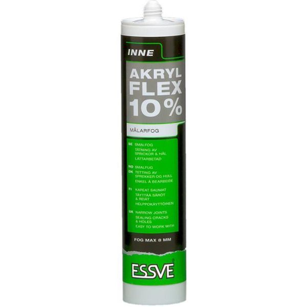 Essve Flex 10 % on valkoinen akryylipohjainen lateksi- / maalarin saumausaine kapeille saumoille ja halkeamille, kun saumalta ei vaadita suurta joustavuutta eikä liikkeenvaimennuskykyä. Flex 10% kestää lyhytaikaista kylmä säilytystä aina -10 °C:seen asti. Maalarin saumausaine on ennen kovettumista vesiliukoinen, joten roiskeet voi puhdistaa vedellä ja kostealla rievulla.