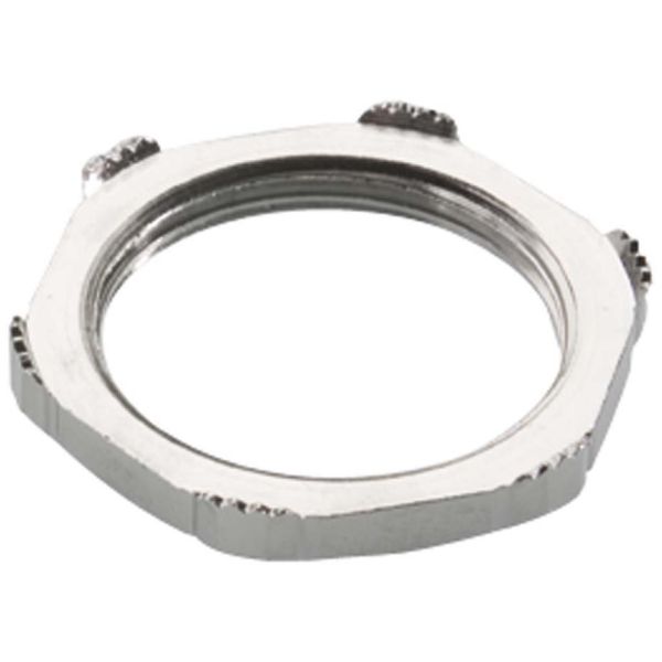 Vastamutteri potentiaalintasaukseen, metrikokoinen kierre, EN 60 423 nikkelipinnoitettu messinki. Vastamutterissa on hammastus, joka leikkaa maalikerroksen läpi, jotta ruuvin ja metallikotelon välinen kosketus olisi optimaalinen.