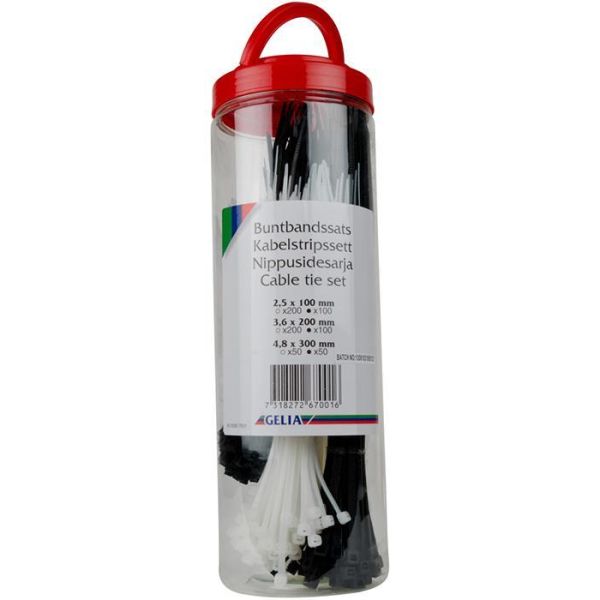 Gelia 4000267001 on nippusidepakkaus, joka toimitetaan kätevässä kahvallisessa säilytystölkissä. Pakkauksessa on yhteensä 700 erikokoista mustaa ja valkoista nippusidettä.