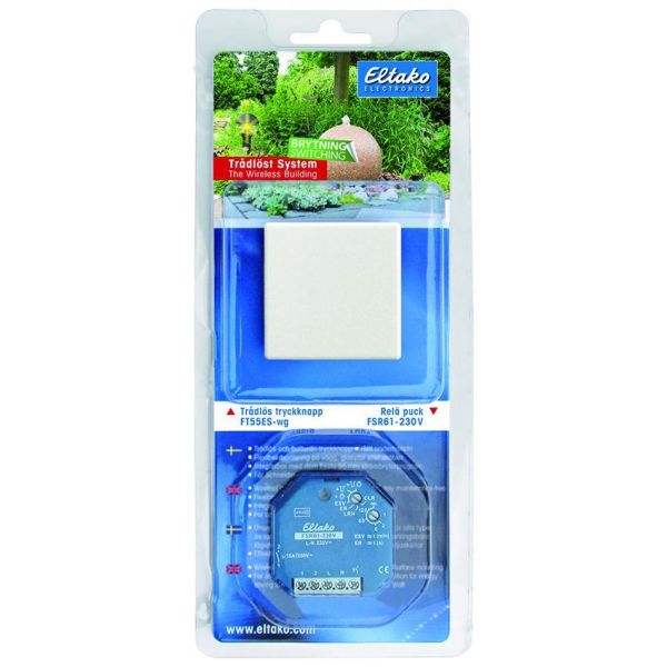 Läpipainopakkaus "katko" koostuu paristottomasta, langattomasta painonapista, valkoinen FT55ES-wg (toimitetaan ilman ulkokehystä), joka täydennetään Schneider-kehyksellä. Mukana kytkinkiekko FSR61-230V, jossa impulssi/työvirran reletoiminto.