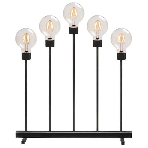 Kynttelikkö, jossa viisi suurta valonlähdettä vaihdettavalla LED-valoilla. Virtalähde 24 voltin muuntaja.
