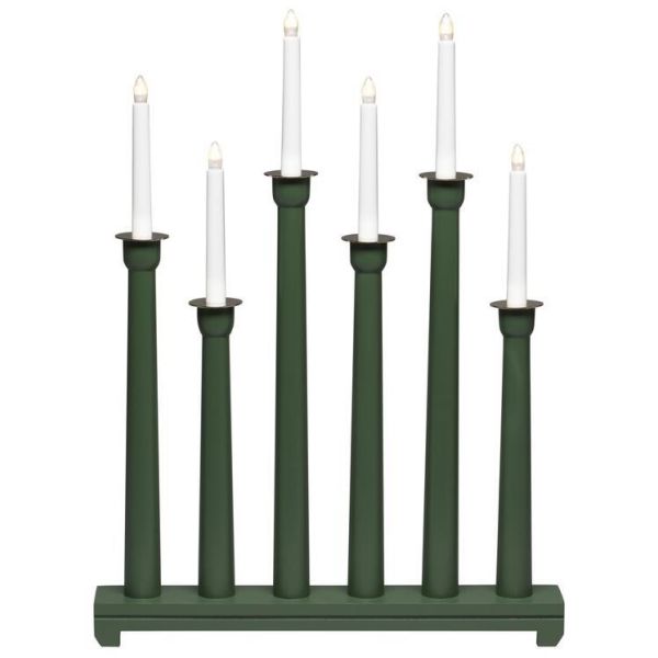 Konstsmide 3978-950 on puinen sähkökynttelikkö 6 kynttilällä. Vihreä, koristerenkaat messingistä. 230V/IP20.
