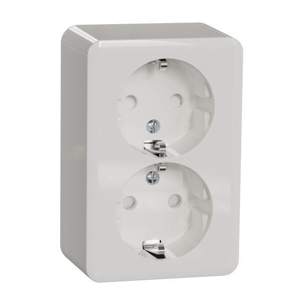 Schneider Electric Exxact 2-osainen pistorasia haaroitettava, pinta-asennus IP21. Ruuviliitos, valkoinen. 16 A /250 V. Modernit ja tyylikkäästi muotoillut Exxact -pinta-asennuskalusteet.