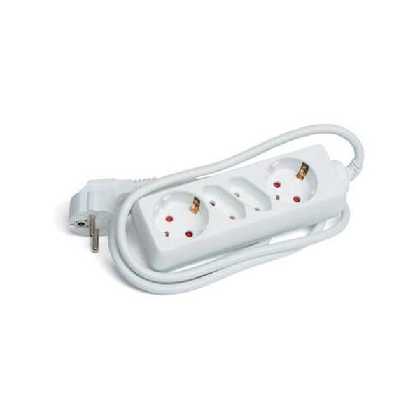 Maadoitettu 2+2-osainen valkoinen haaroitusjatkojohto. 2 Schuko 45 gr ja 2 Euro-pistorasiaa.
