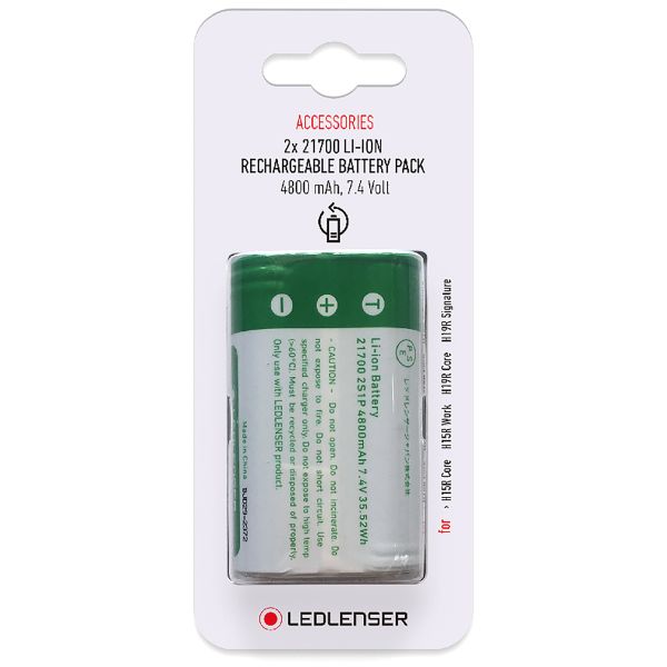 Led Lenser LL502310 on Li-ion-akku tyyppiä 2 x 21700, jossa jännite 3,7 V. Akku sopii malliin H15R Work. 4800 mAh. 17.76 Wh.