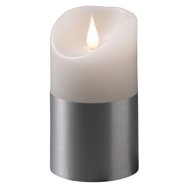 Konstsmide 1820-300 on valkoinen LED-vahakynttilä koristeella (hopea), 7,5x13,5 cm. Ajastin 4/8 h, 2xC.