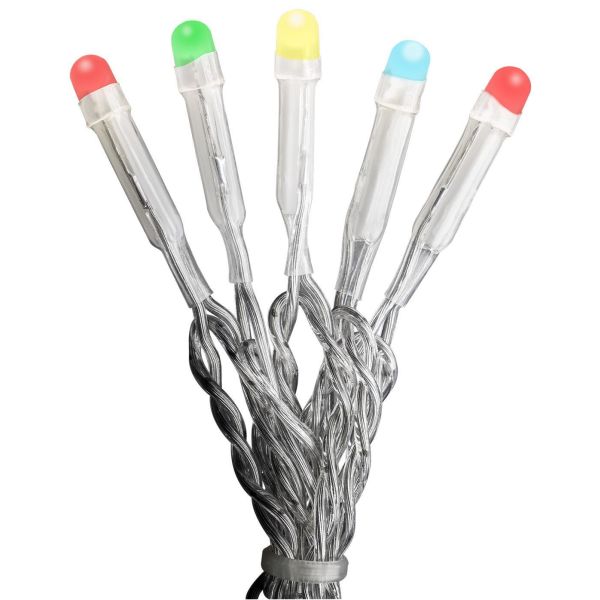 Konstsmide 6344-523 on valosarja, jossa on 100 moniväristä LEDiä (huurrettu). Läpinäkyvä kaapeli, 30V/IP20.