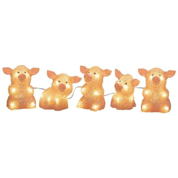 Viisi istuvaa akryylisikaa. Sikojen välinen etäisyys on 1 m ja läpinäkyvä liitäntäkaapeli on 5 m. Koristevalaisin sopii myös ulkokäyttöön.