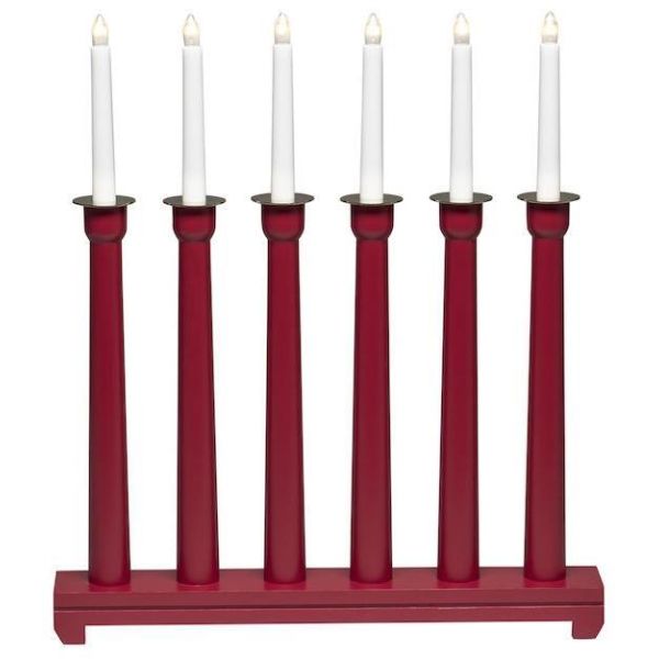 Puinen punainen kynttelikkö, jossa on kuusi kynttilää ja kokonaiskorkeus 50 cm. Liitäntäkaapeli on 1,7 metriä.