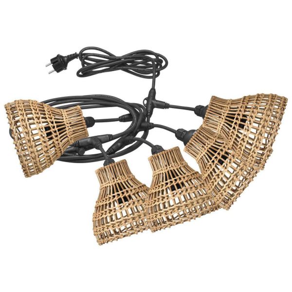 Flex Out -valosarja (IP44) 5 x E27-lampunpitimellä (maks. 15W) ja varjostimella. Kokonaispituus 6,5 m, 2,5 m ensimmäiseen lampunpitimeen, sitten 80 cm kunkin lampunpitimen välillä. 5 kpl Sarah -varjostimia luonnonmateriaaleista. Varjostimien leveys 18 cm ja korkeus 18 cm. Ulkokäyttöön soveltuva valonlähde E27 ostetaan erikseen. Varjostimet on valmistettu luonnonmateriaaleista ja altistus sääolosuhteille voi vaikuttaa varjostimien ulkonäköön ajan kuluessa.