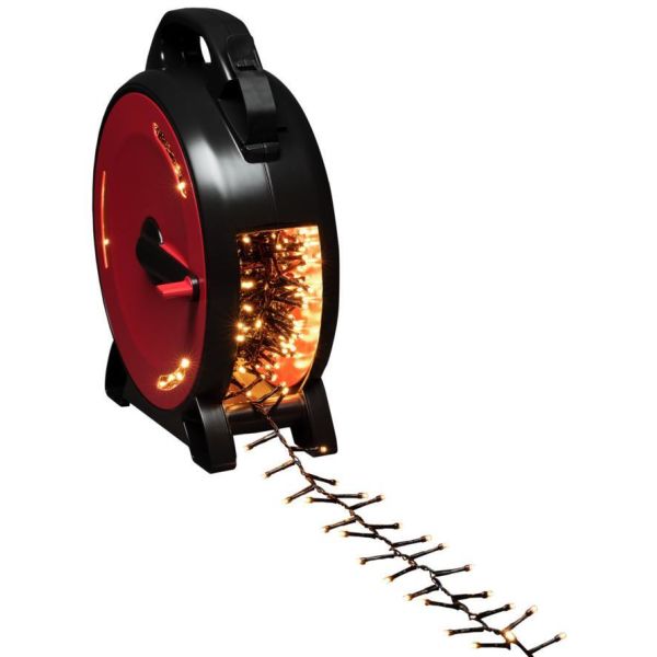 Konstsmide 3849-800 on valosarja kelalla, jossa on 1000 LEDiä (cluster, valon väri amber). Musta johto, 30V/IP44.