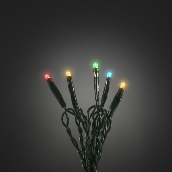 Konstsmide 6351-520 on valosarja, jossa on 20 moniväristä LEDiä. Tummanvihreä kaapeli, 24V/IP20.
